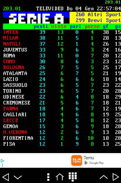 Vincono tutte le prime della classe : l’Inter maltratta il Bologna, il Napoli espugna l’Olimpico di fede laziale ed il Milan vince di misura in quel di Cagliari. Si inceppa la Juventus costretta al pareggio casalingo da un coraggioso Lecce mentre il Como vince di rigore contro l’Udinese e continua a risalire la classifica. Nella parte bassa della graduatoria il Torino espugna il campo del Verona e si allontana dalla zona calda mentre la Fiorentina vince all’ultimo respiro contro la Cremonese e si prende una boccata d’ossigeno ; pareggio nel derby emiliano fra Sassuolo e Parma. Ritorno amaro di Gasperini nella sua Bergamo : gli orobici superano la Roma. Risultati serie A giornata 18.