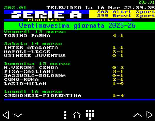L’Inter frena ancora, l’Atalanta costringe la Beneamata al pareggio casalingo ; non ne approfitta il Milan sconfitto di misura all’Olimpico da una rediviva Lazio. Va al Como lo scontro Champions contro la Roma, non molla la Juventus corsara sul campo dell’Udinese. Il Napoli ribalta il Lecce mentre il Bologna fa suo il derby emiliano contro il Sassuolo ; va alla Fiorentina lo scontro salvezza contro una Cremonese sempre più in crisi. Il Torino ne fa quattro al Parma, il Genoa espugna il “Bentegodi” e si avvicina a grandi passi alla salvezza. Risultati serie A giornata 29.