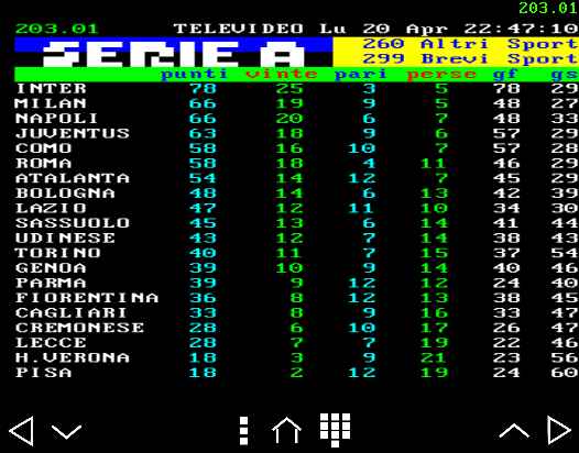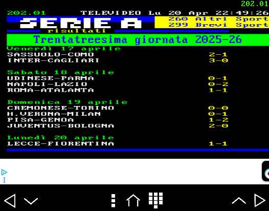 Continua la marcia dell’Inter verso la conquista dello Scudetto : i neroazzurri spazzano via il Cagliari a San Siro. Il Napoli viene sconfitto a domicilio dalla Lazio e viene raggiunto al secondo posto in classifica dal Milan corsaro a Verona ; quarta piazza della graduatoria appannaggio della Juventus che liquida il Bologna. Cade nuovamente il Como sconfitto da un sempre più sorprendente Sassuolo mentre termina in parità il big match di giornata fra Roma ed Atalanta. Il Parma espugna il campo dell’Udinese e conquista la salvezza pressoché matematica, Cremonese e Lecce pareggiano rispettivamente contro Torino e Fiorentina e continuano la propria lotta punto a punto per evitare la retrocessione. Risultati serie A giornata 33.