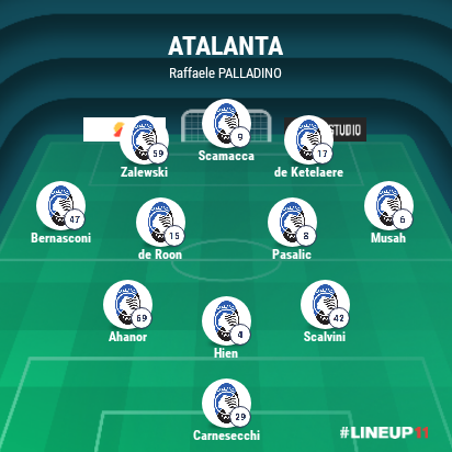 ATALANTA. Carnesecchi, Hien, Musah (56′ Zappacosta), Pasalic (56′ Ederson), Scamacca (56′ Raspadori), de Roon, de Ketelaere, Scalvini (70′ Krstovic), Bernasconi, Zalewski (81′ Sulemana), Ahanor. Allenatore Palladino. A disposizione : Rossi, Sportiello, Kossounou, Samardzic, Kolasinac, Maldini.