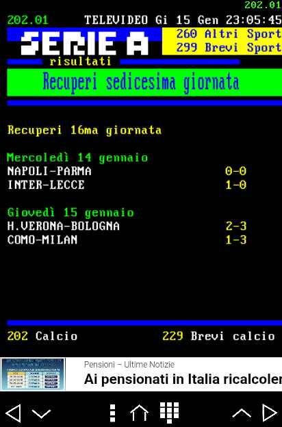 L’Inter supera con fatica il Lecce ed allunga in classifica sul Napoli costretto al pareggio casalingo da un ottimo Parma ; resta invece in scia della Beneamata il Milan corsaro a Como. Torna alla vittoria il Bologna che inguaia ulteriormente il Verona. Risultati serie A recuperi giornata 16.
